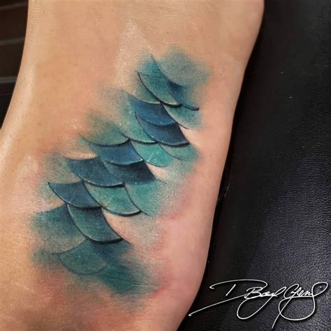 See more ideas about mermaid scales tattoo, scale tattoo, mermaid tattoos. This design, placed on the arm of the wearer, shows a more serious mermaid that even looks threatening. Black and grey mermaid scale tattoo on girl right thigh. Blue ink mermaid scale tattoo on right foot. The tattoo is framed by flowers.