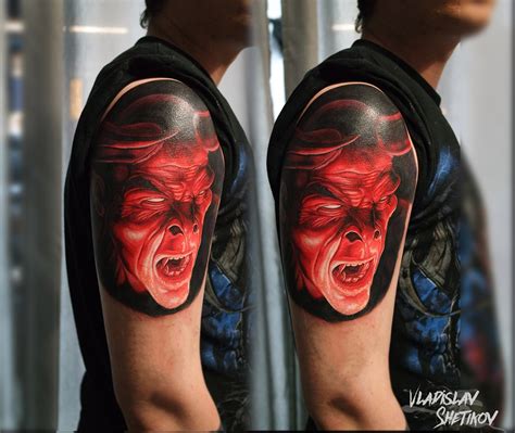 Red Demon Tattoo, With a 224 colours for all of your great artwork, this ink will make your. Tri faced evil demon & girl face tattoo on man half sleeve.