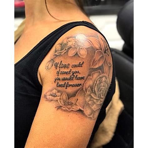 Great flower remembrance tattoo on upper back. The roots of the tree in the tattoo design can be formed in such a way to depict the mother’s name, a date, or a short message. The quote reads “she lived and laughed and loved and left”. You will often see these types of tattoo designs filled with creative elements such as.