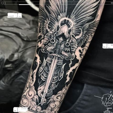 Sword tattoo with angel warrior. Depression and anxiety tattoo with black woman ink Grey ink warrior angel tattoo on back body. Left half sleeve warrior angel girl tattoo. Grey ink warrior angel tattoo on right back shoulder.